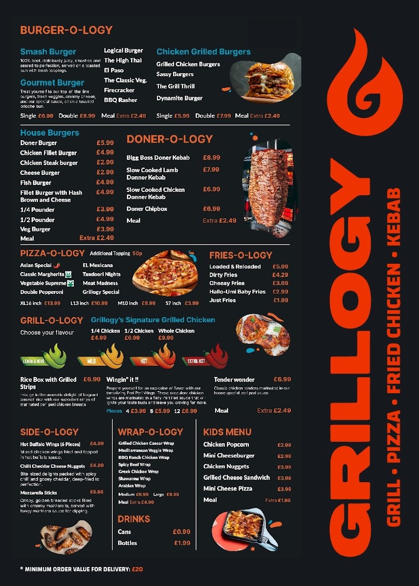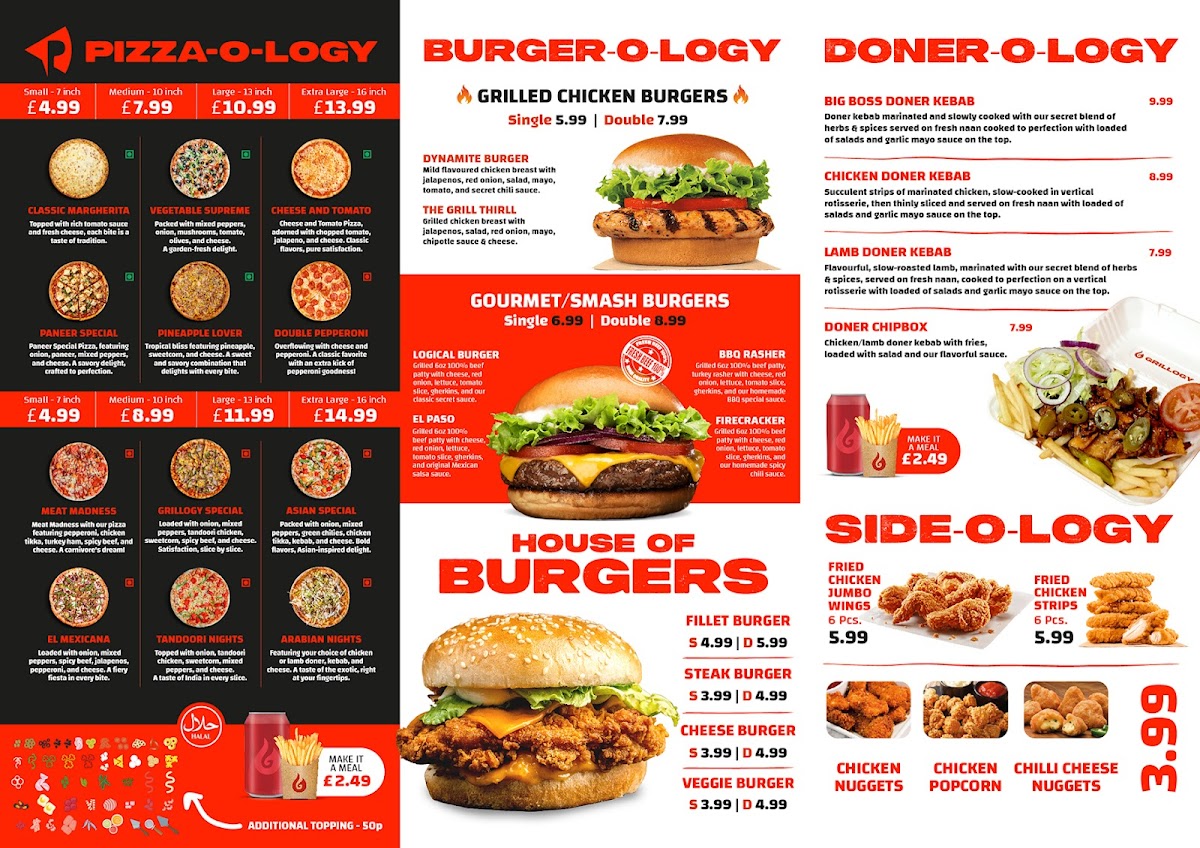 The menu at Grillogy features a variety of options focusing on grilled and fried chicken, burgers, doner kebabs, and traditional halal dishes. It is structured into several distinct categories, offering a range of choices to suit different preferences and mealtime needs.